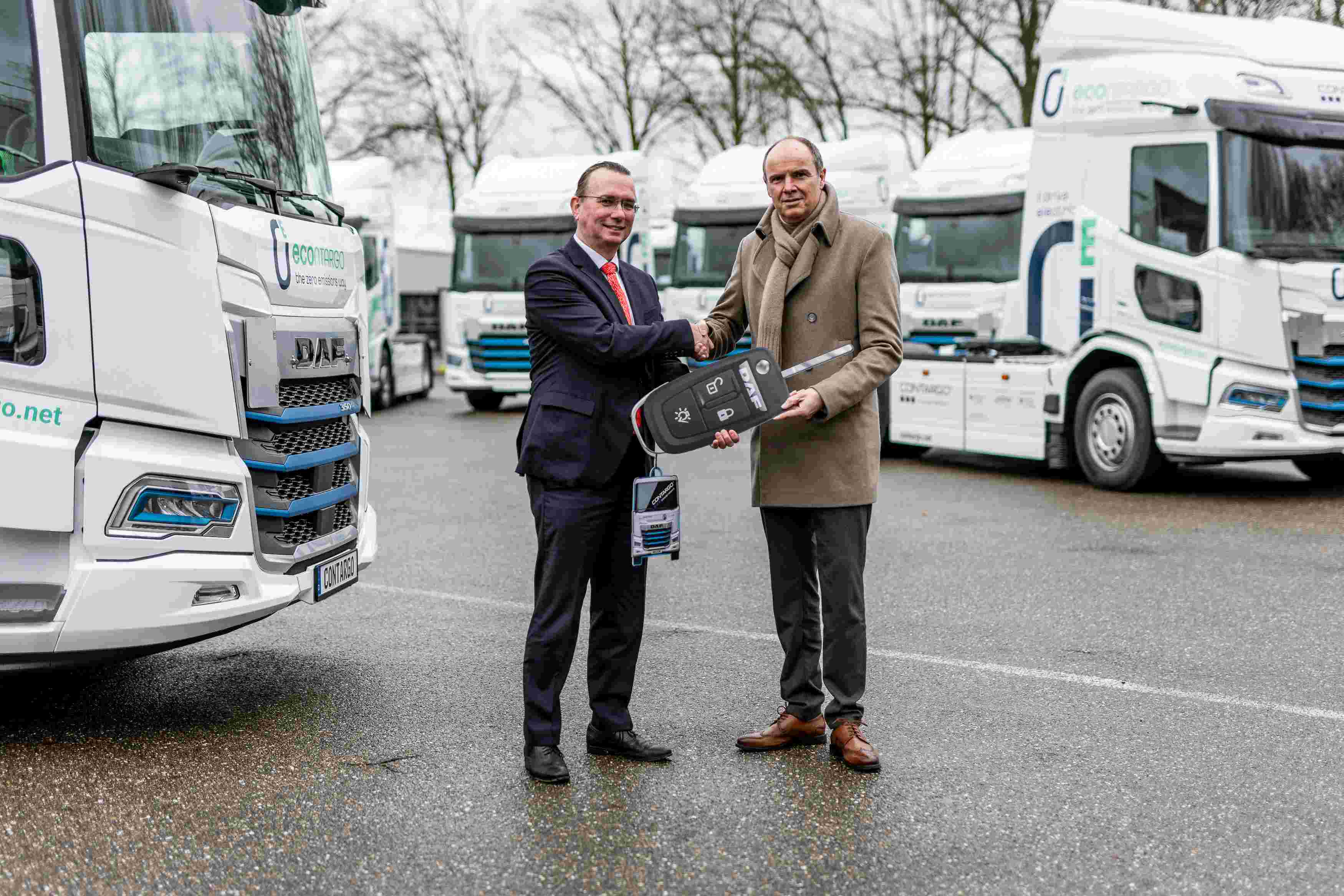 Harald Seidel, Presidente di DAF Trucks (a sinistra), consegna una chiave simbolica a Jürgen Albersmann, CEO di Contargo GmbH & Co. Kg.