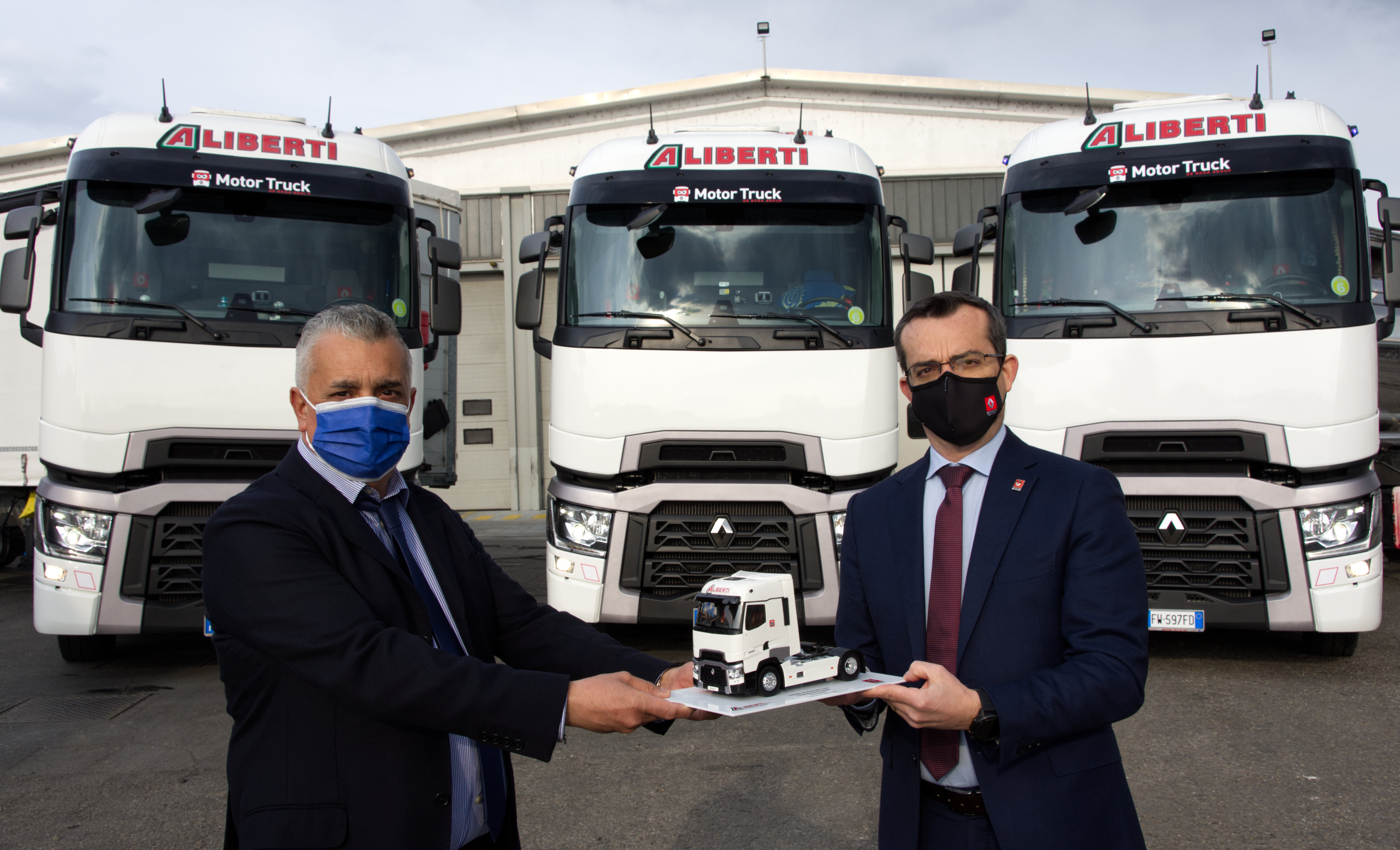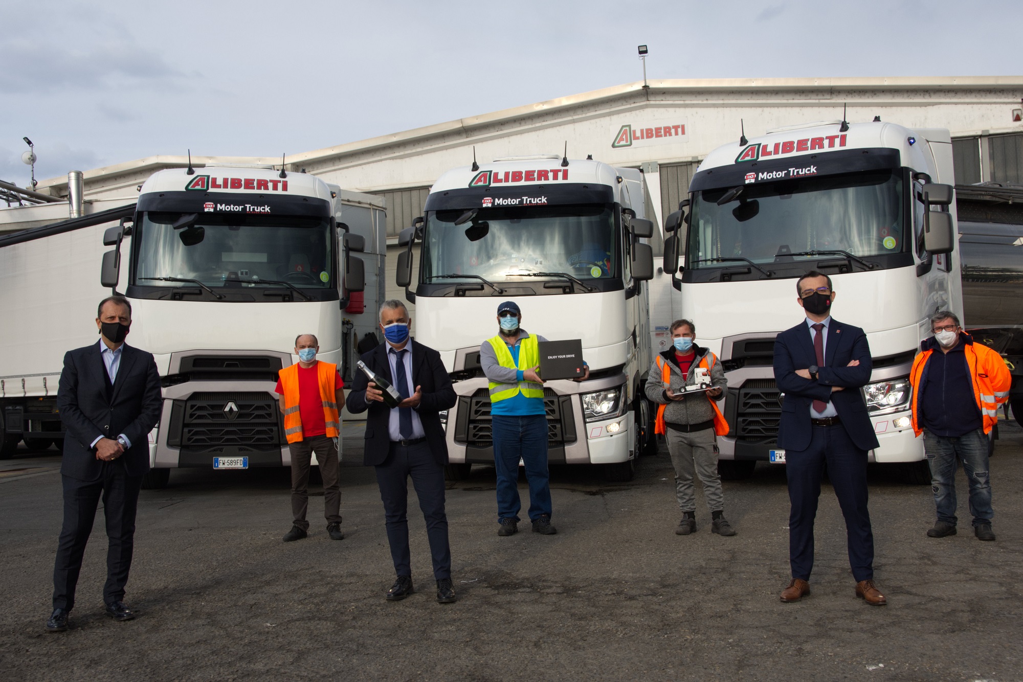 La cerimonia di consegna dei primi 20 trattori stradali Renault Trucks T High 520 si è svolta alla presenza di  Pierre Sirolli e Luigi Beccalli, rispettivamente  A.D. e Key Account Manager di Renault Trucks Italia, di Gino Aliberti, Presidente dell’omonima società di autotrasporto e alla presenza del suo Team e di alcuni autisti.