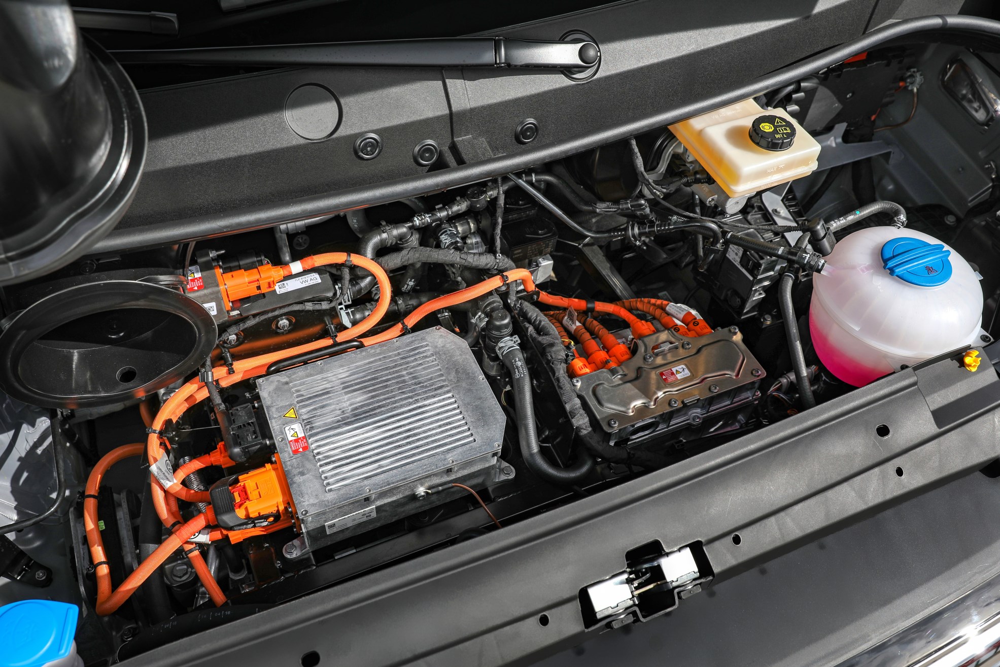 Nell’e-Crafter il motore elettrico sincrono EEM85, da 136 CV (100 kW) e 290 Nm di coppia, è posizionato anteriormente. il consumo di corrente elettrica nel ciclo combinato è di 21,54 kW/100 km (dati Volkswagen).