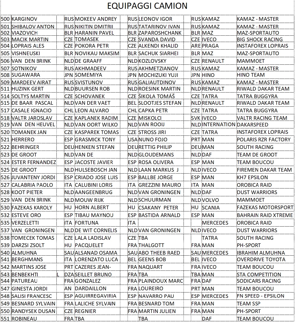 Già da questo primo risultato vediamo che quest’anno il compito di contenere l’irruenza dei potenti Kamaz spetta ai russi MAZ. Ma anche gli IVECO Powrestar del team ceco di Martin Macik si faranno notare. E poi c’è il musone International Lonestar motorizzzto Scania del team Van Den Heuvel pronto a dire la sua. Insomma sembra che le sorprese non mancheranno!