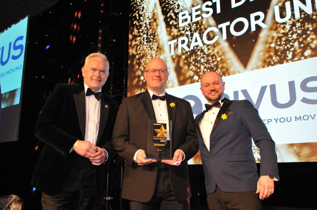 Dave Jones, di Rivus Fleet Management Solutions, sponsor dell’evento (a destra), offre il premio per il miglior trattore diesel del Regno Unito a Laurence Drake, Managing Director di DAF Trucks in UK (al centro). A sinistra, il presentatore della cerimonia di premiazione, Huw Edwards.