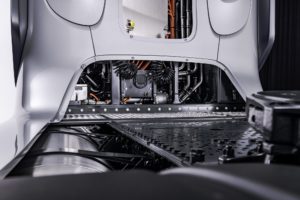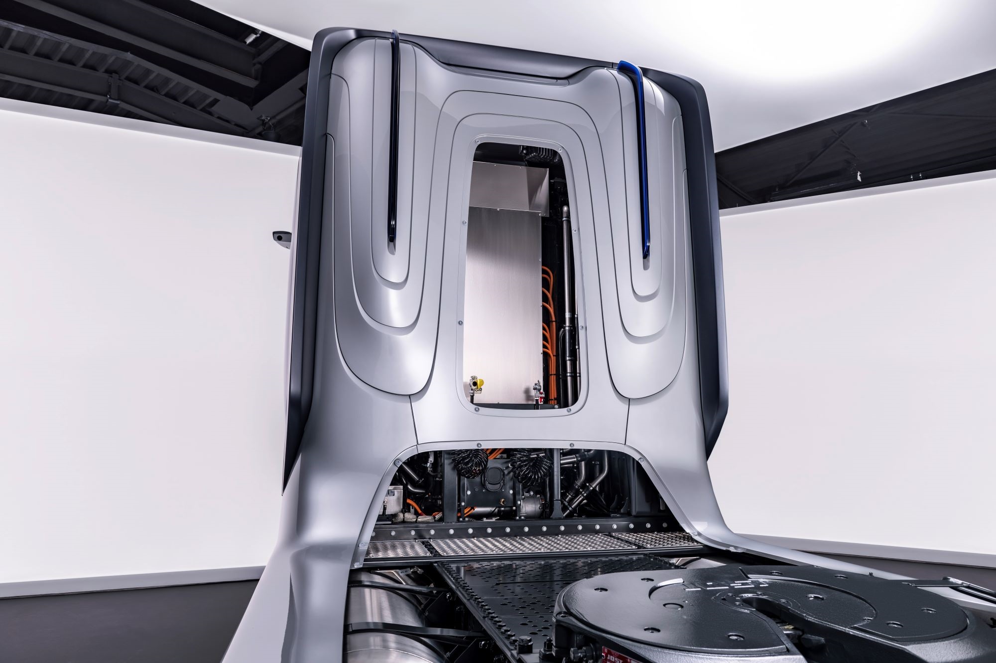 La capacità di stoccaggio della batteria è relativamente bassa (70 kWh), poiché servirà per supportare soprattutto l’erogazione della potenza delle celle a combustibile in base alla situazione, per esempio, durante i picchi di carico in fase di accelerazione o durante le marce in salita a pieno carico. Nel veicolo di serie, la batteria verrà ricaricata utilizzando l’energia di frenata e l’energia delle celle a combustibile in eccesso. Elemento centrale della sofisticata strategia di funzionamento dei sistemi di celle a combustibile abbinato alle batterie è l’impianto di raffreddamento e riscaldamento che mantiene tutti i componenti ad una temperatura di esercizio ideale, garantendone così la longevità. Nella versione preserie, i due motori elettrici erogano una potenza continua di 2 x 230 kW ed una potenza massima di 2 x 330 kW. La coppia è pari a 2 x 1577 Nm o 2 x 2071 Nm.