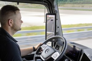 La filosofia di sicurezza dell’eActros 600 si basa sull’evoluzione di collaudati sistemi di assistenza MBT, la cui base è rappresentata da una nuova piattaforma elettronica e dalla cosiddetta ‘sensor fusion’ ad essa associata, che consente di unire i dati di radar e telecamere per ottenere una visuale ancora più ampia sulla zona anteriore e laterale del veicolo. A tal fine, la piattaforma elettronica offre un’elaborazione dei dati 20 volte superiore. I sei sensori montati – 4 radar a corto raggio ed uno a lungo raggio, oltre alla telecamera multifunzione sul parabrezza – nel complesso, coprono un angolo di 270° intorno al veicolo.