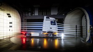 In questo modo è stato possibile ridurre il coefficiente cX della cabina ProCabin del 9% rispetto all’attuale cabina dell’Actros convenzionale. Il miglioramento aerodinamico riduce il consumo di energia del veicolo e quindi contribuisce in modo decisivo a raggiungere l’autonomia di 500 km dell’eActros 600.