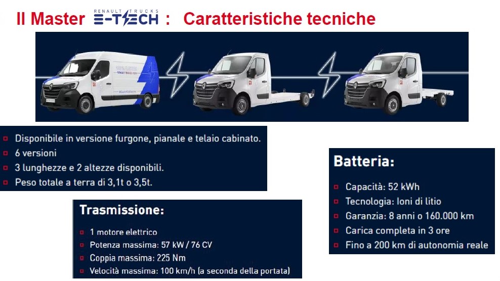 “Il Master eTech è un prodotto che attualmente ci sta dando molte soddisfazioni per quanto riguarda le vendite nel comparto elettrico – dichiara Andrea Rossini, responsabile trazioni elettriche di Renault Trucks Italia – grazie alla batteria di trazione rinnovata da 52 kWh è stato possibile realizzare questo nuovo progetto in partnership con Lamberet. Siamo intervenuti sulle sospensioni posteriori rinforzandole per accogliere la cella refrigerata. Questo è un veicolo omologato, secondo la nuova normativa del codice della strada, con una PTT di 39 quintali. La trazione elettrica permette di lavorare nelle ZTL e, grazie all’assenza di rumore, anche di notte. Si può ricaricare tranquillamente anche con due banalissime spine Shuko collegate a prese a muro da 220W: una per la batteria di trazione ed una per la batteria del gruppo frigo.”