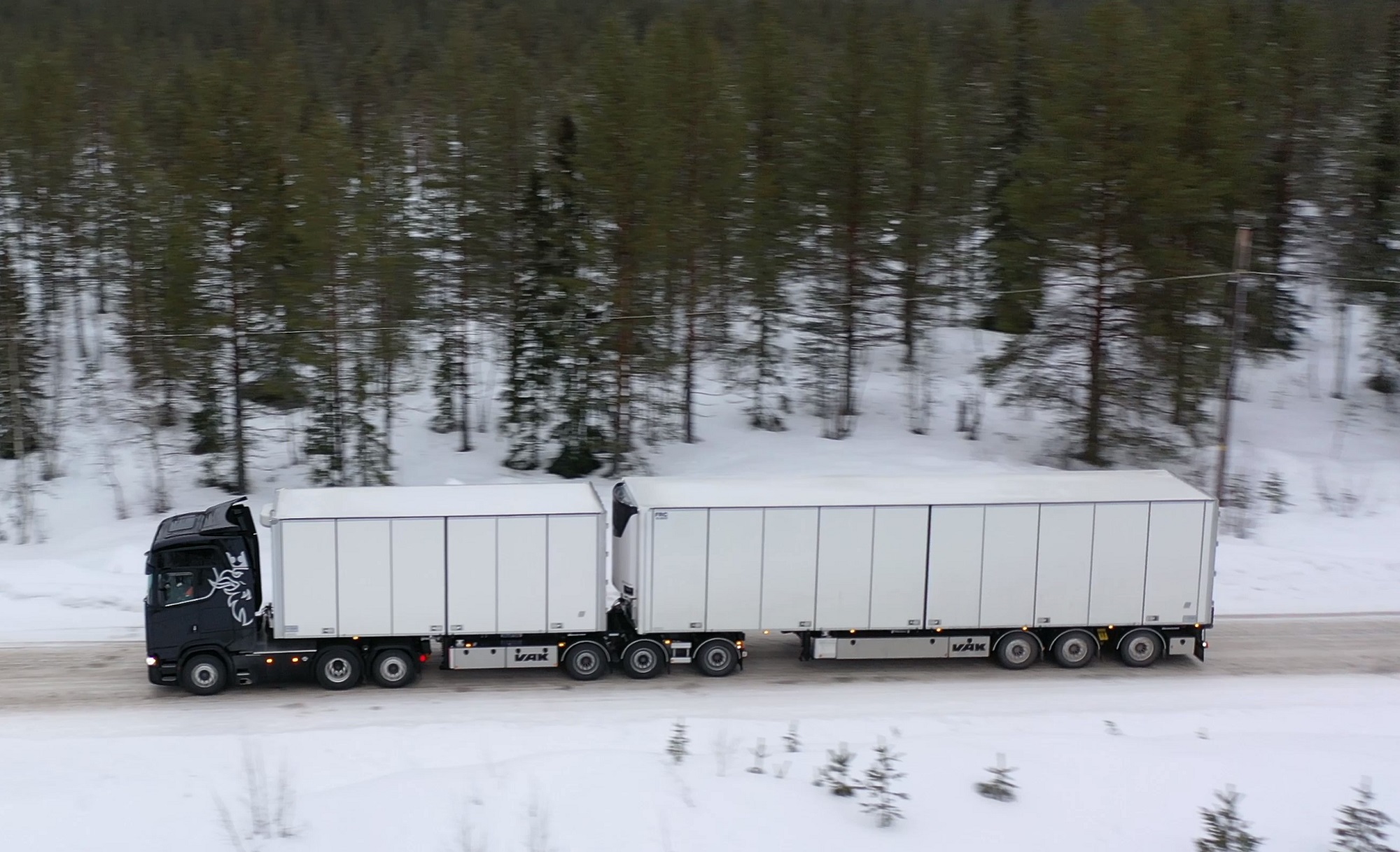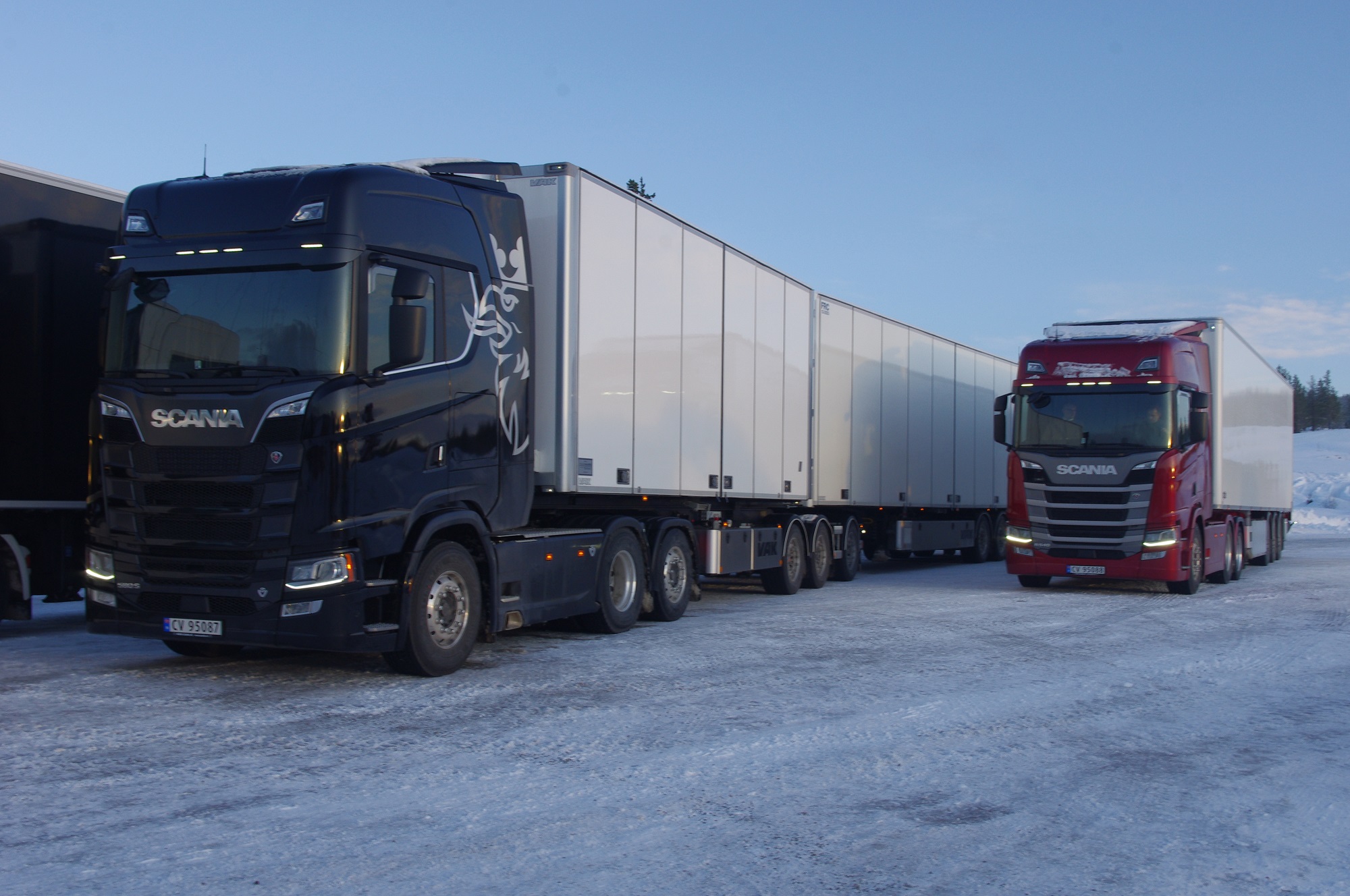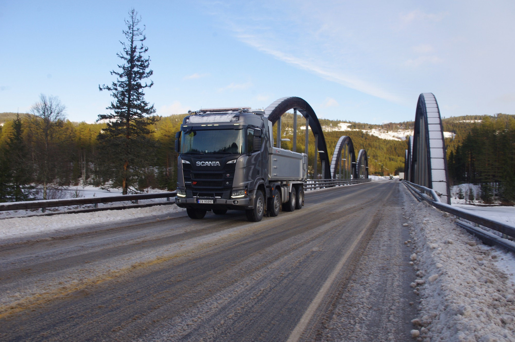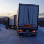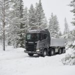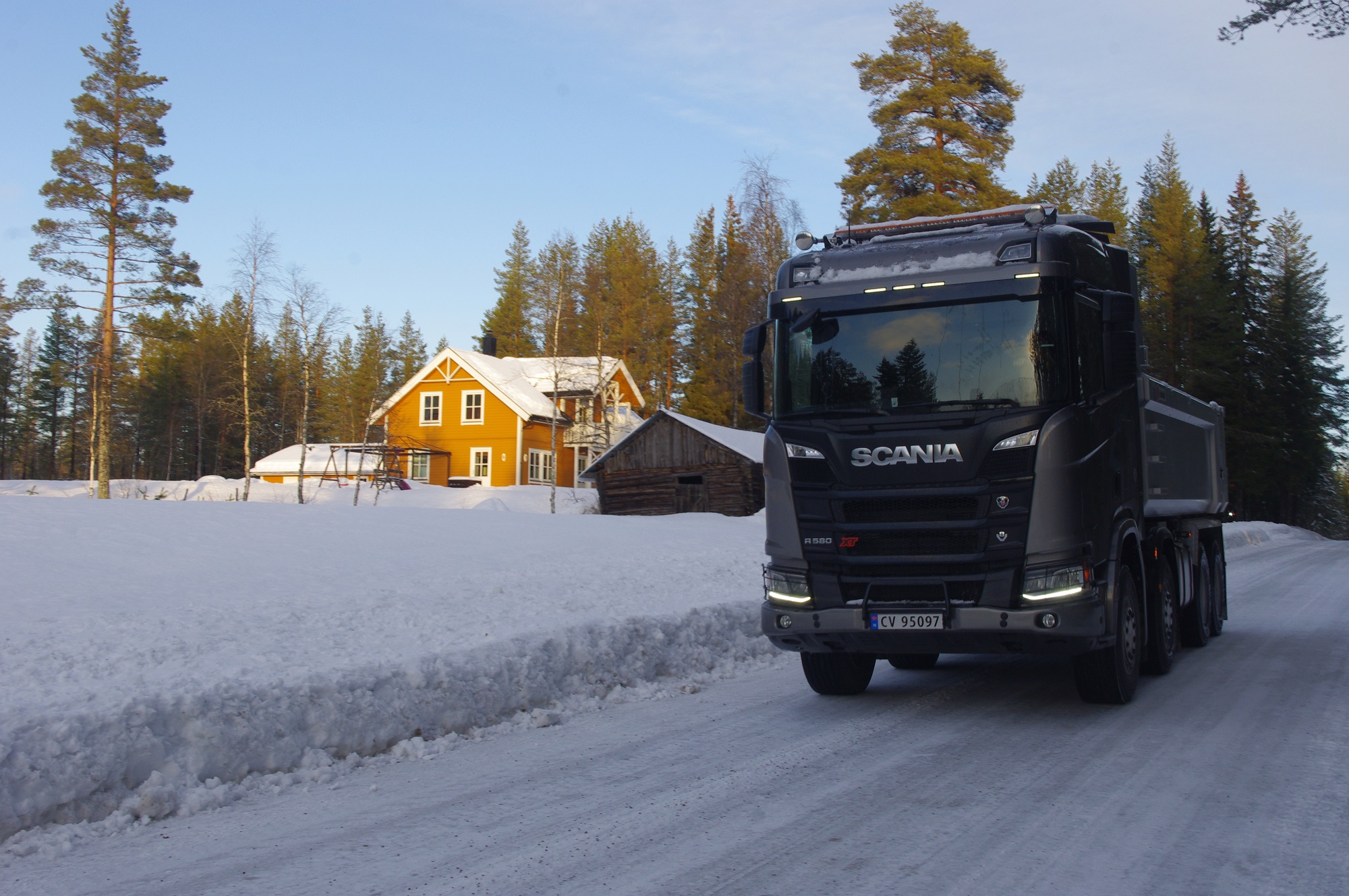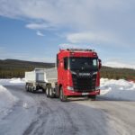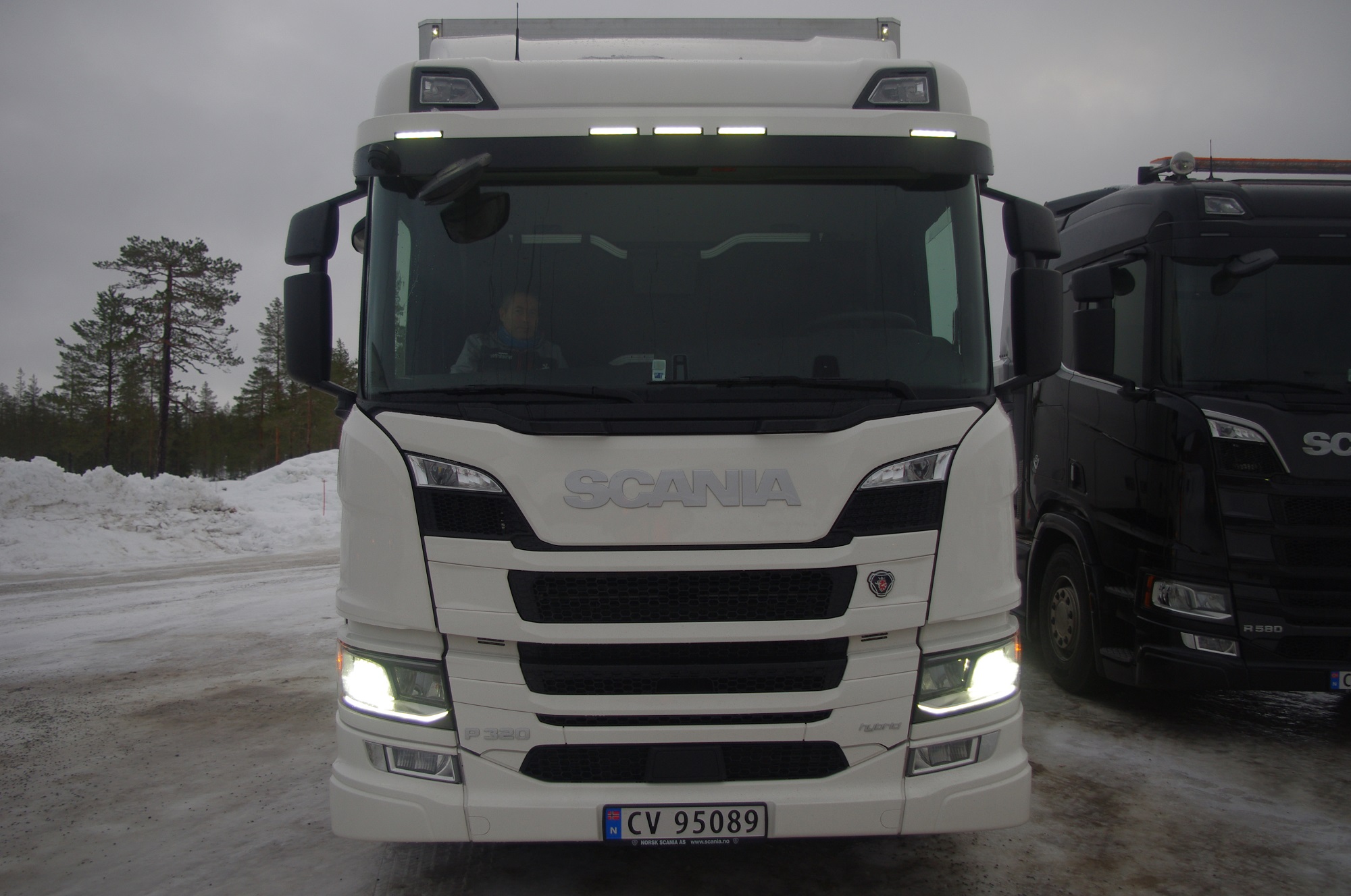 Una combinazione impressionante, omologata solo per i paesi scandinavi, che raggiunge una lunghezza totale di 25,25 metri. Peso totale ammesso: 66 ton! Al posto guida c’è un burbero “vichingo” che non si fida (e fa bene) a lasciare nelle nostre mani il mostro, spiegando che se poco poco rimaniamo bloccati in salita sul ghiaccio non ne usciamo più! Quindi una volta disinserito il freno, il demo driver seleziona la D e parte tirandosi dietro il “transatlantico” a pieno carico senza sforzo. Abbiamo così modo di apprezzare l’elasticità del potente V8 Scania da 580 CV, in grado di erogare una coppia di 2960 Nm a partire dai 1000 e 1350 giri/min. Con un certo timore ci inoltriamo nello stretto circuito. Il driver ci mostra da un display, collegato ad una telecamerina piazzata sotto il telaio, che alza la sospensione del tandem motore per affrontare il percorso innevato. A questo punto usciamo sulla statale. La strada si intuisce a malapena nel bianco totale. Il driver accelera e l’opticruise spara le marce una dopo l’altra con rapidità. Camminare a 80 km/h con un bestione del genere sulla statale norvegese ghiacciata fa un certo effetto, specie quando si incontra una altro truck lanciato alla stessa velocità nel senso opposto. Gli specchietti si sfiorano, i due autisti rimangono impassibili, così come i loro piedi destri sull’acceleratore! Attraversiamo un suggestivo ponte su un fiume gelato e, alla prima rotonda, torniamo indietro per finire il nostro giro. Il comfort in cabina è notevole grazie alle sospensioni pneumatiche integrali. Il sudore che ci imperla la fronte non è dovuto al caldo.