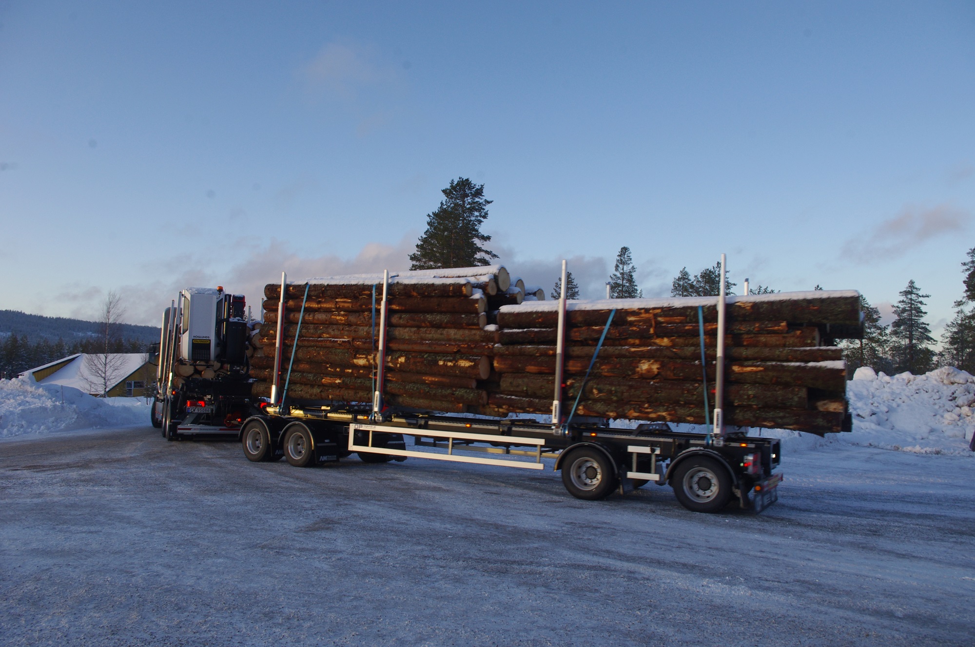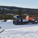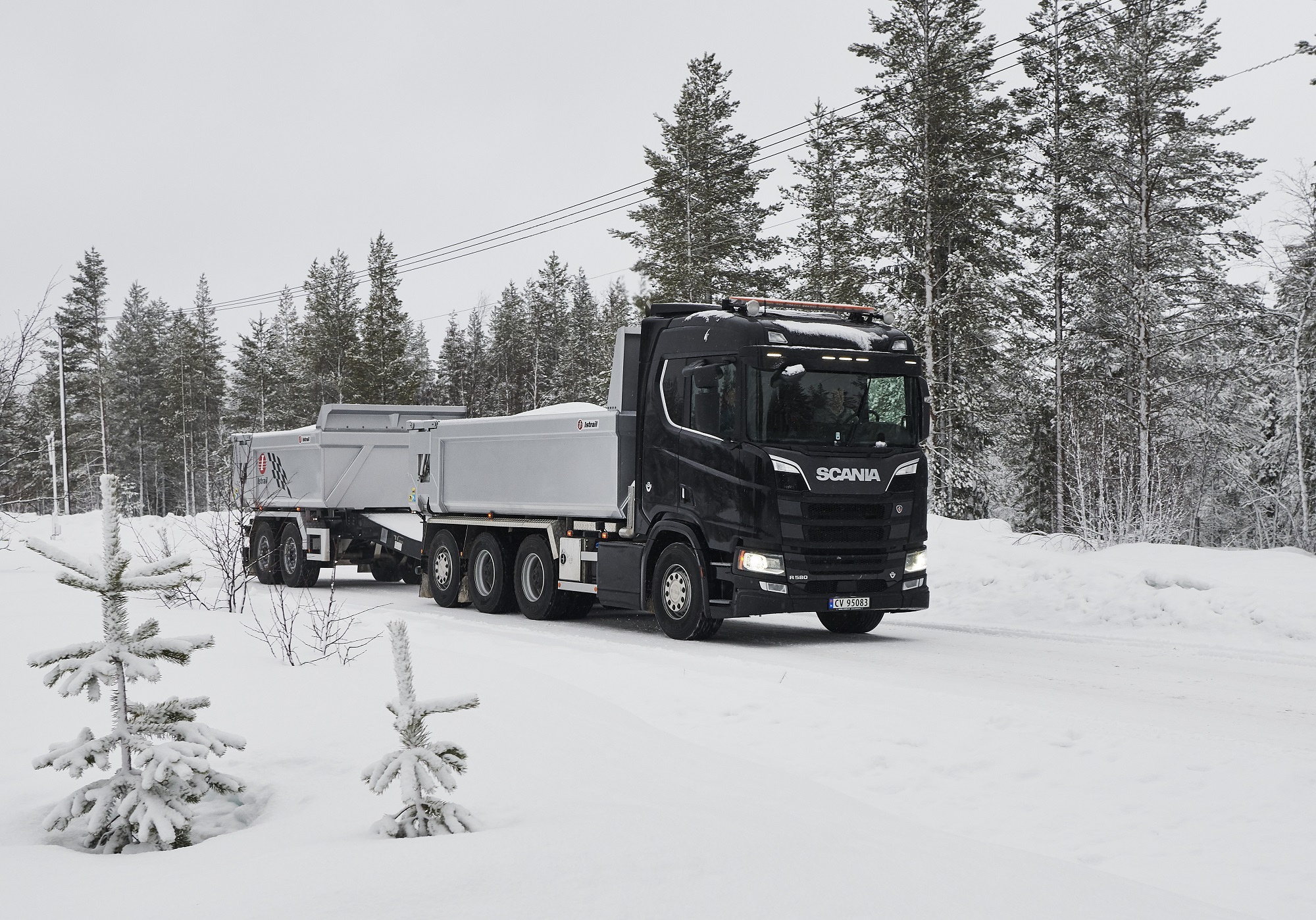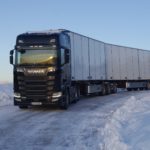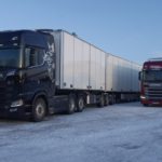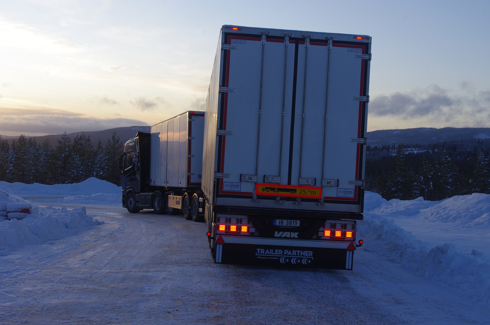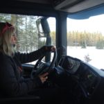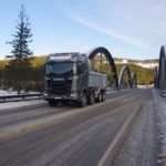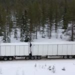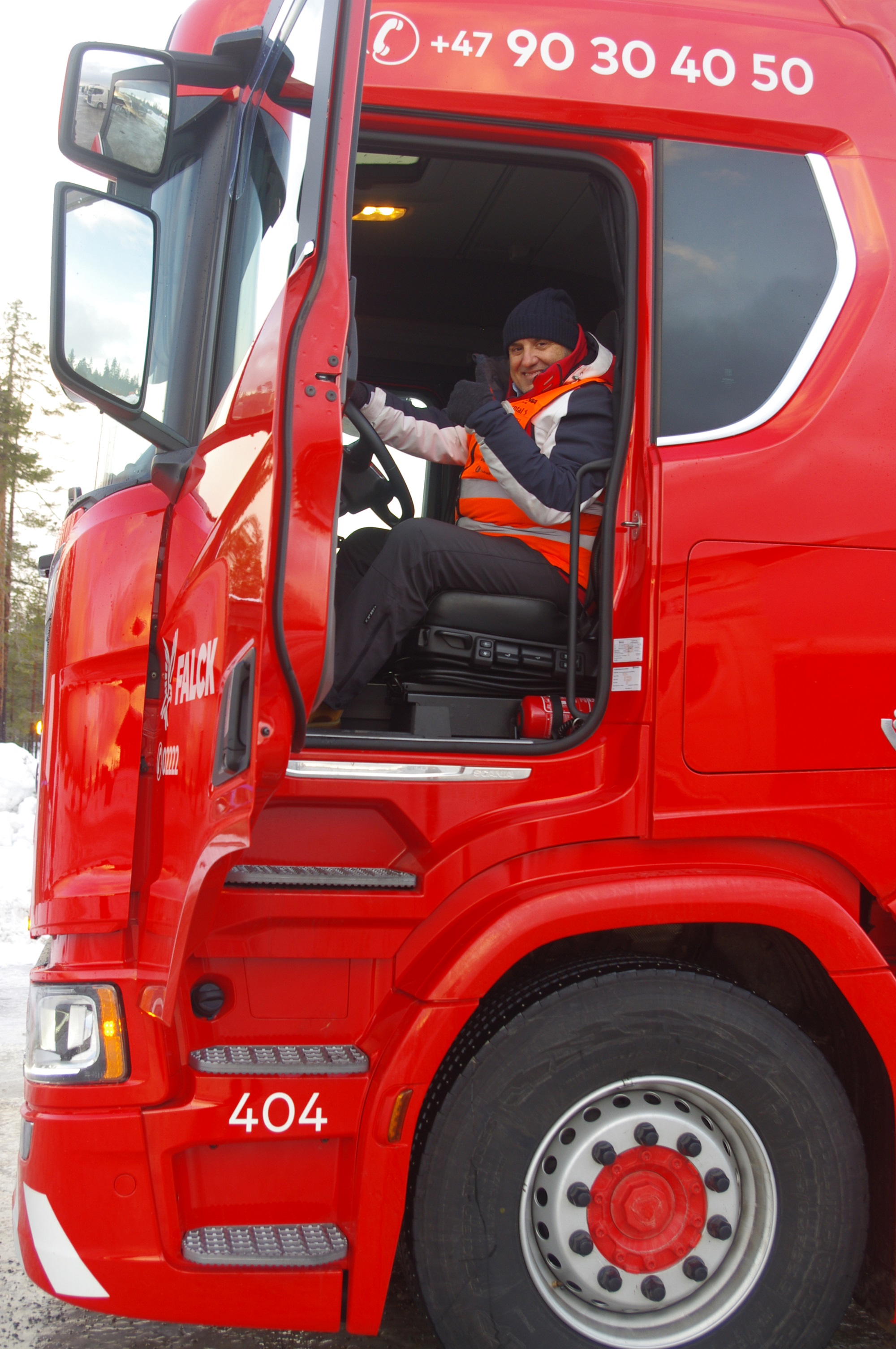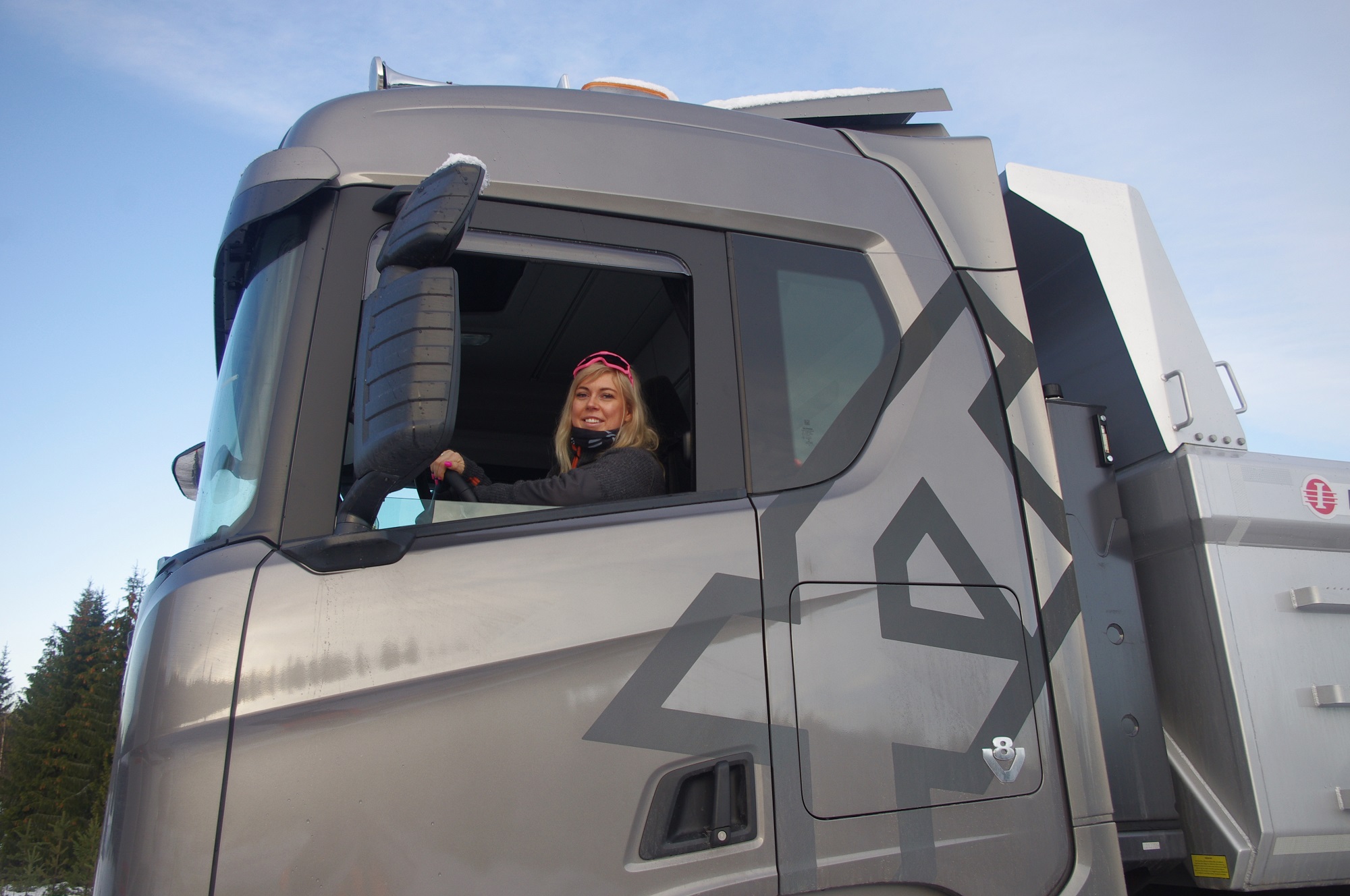 Una combinazione impressionante, omologata solo per i paesi scandinavi, che raggiunge una lunghezza totale di 25,25 metri. Peso totale ammesso: 66 ton! Al posto guida c’è un burbero “vichingo” che non si fida (e fa bene) a lasciare nelle nostre mani il mostro, spiegando che se poco poco rimaniamo bloccati in salita sul ghiaccio non ne usciamo più! Quindi una volta disinserito il freno, il demo driver seleziona la D e parte tirandosi dietro il “transatlantico” a pieno carico senza sforzo. Abbiamo così modo di apprezzare l’elasticità del potente V8 Scania da 580 CV, in grado di erogare una coppia di 2960 Nm a partire dai 1000 e 1350 giri/min. Con un certo timore ci inoltriamo nello stretto circuito. Il driver ci mostra da un display, collegato ad una telecamerina piazzata sotto il telaio, che alza la sospensione del tandem motore per affrontare il percorso innevato. A questo punto usciamo sulla statale. La strada si intuisce a malapena nel bianco totale. Il driver accelera e l’opticruise spara le marce una dopo l’altra con rapidità. Camminare a 80 km/h con un bestione del genere sulla statale norvegese ghiacciata fa un certo effetto, specie quando si incontra una altro truck lanciato alla stessa velocità nel senso opposto. Gli specchietti si sfiorano, i due autisti rimangono impassibili, così come i loro piedi destri sull’acceleratore! Attraversiamo un suggestivo ponte su un fiume gelato e, alla prima rotonda, torniamo indietro per finire il nostro giro. Il comfort in cabina è notevole grazie alle sospensioni pneumatiche integrali. Il sudore che ci imperla la fronte non è dovuto al caldo.