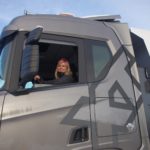 Come primo veicolo scegliamo un autocarro da cava allestito con vasca ribaltabile R580 XT V8, 8×4, quattro assi di cui i due anteriori sterzanti, condotto dalla bella e brava Julianne Brox, unica ragazza tra i demo driver che ci accompagnano. Julianne cede gentilmente il posto guida, pur rimanendo vigile e attenta al nostro fianco per un breve giro all’interno del circuito, visto che non abbiamo le patenti necessarie per circolare sulla strada statale.