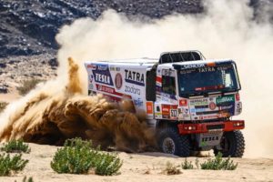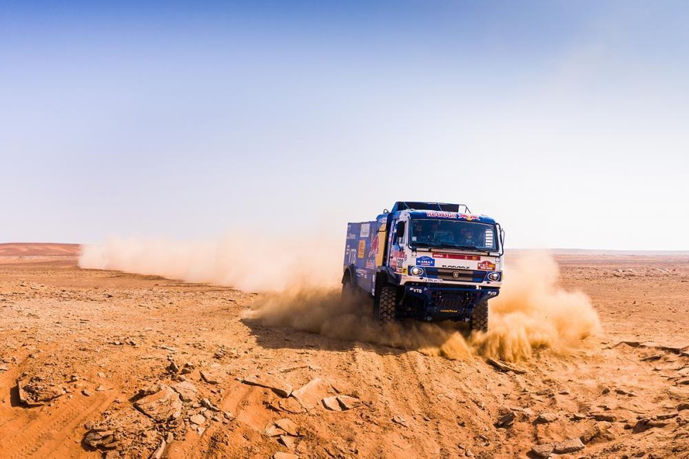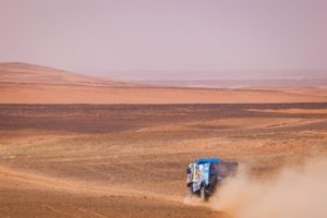 Nuova tripletta Kamaz al traguardo dell’ottava tappa con Shibalov (#501) talia per primo il traguardo di tappa davanti a Sotnikov (#507) che, tuttavia, mantiene un distacco di più di un’ora dal suo “rivale” nel team. In terza posizione si piazza Karginov (#500). Quarto e quinto posto sono rispettivamente di Vishneuski con il MAZ #505 e di Casale con il Tatra #517.