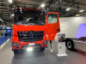 Uno sfacciato Mercedes-Benz Arocs dipinto in uno sfacciato rosso aragosta spicca in mezzo al bianco verginale dello stand.
