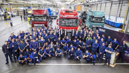 Ha preso il via negli stabilimenti di Eindhoven la produzione dei nuovi veicoli DAF. Il n. 1, un XG+ rosso, “Job One” Il sindaco di