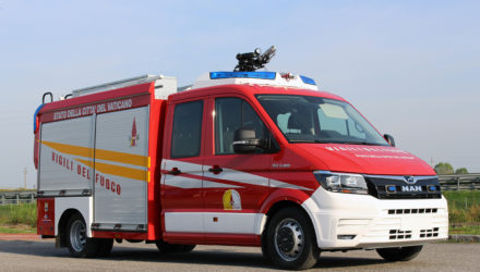 I Vigili del Fuoco al servizio della Santa Sede hanno ricevuto in dono da MAN Truck & Bus Italia un TGE con allestimento antincendio L’autopompa