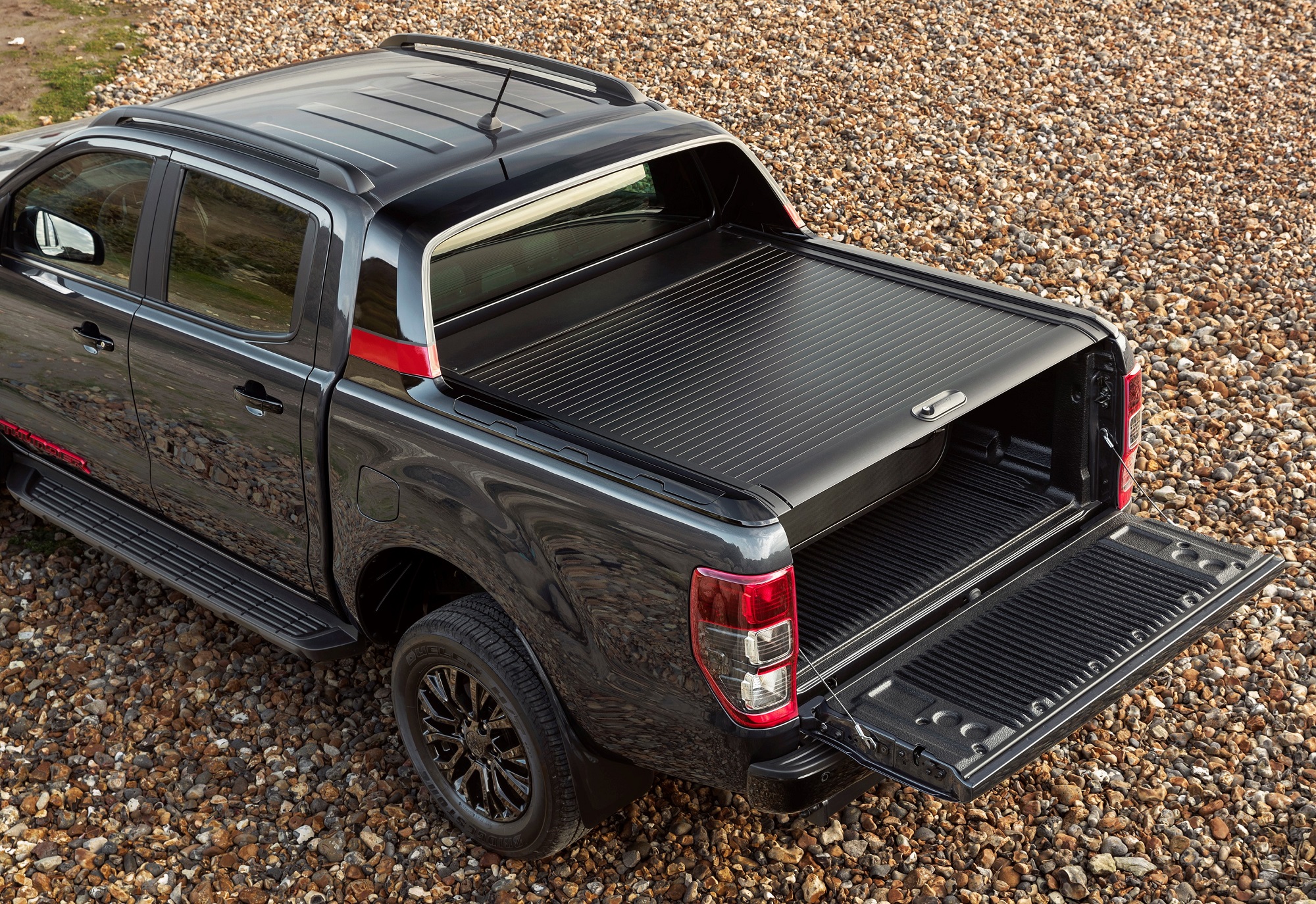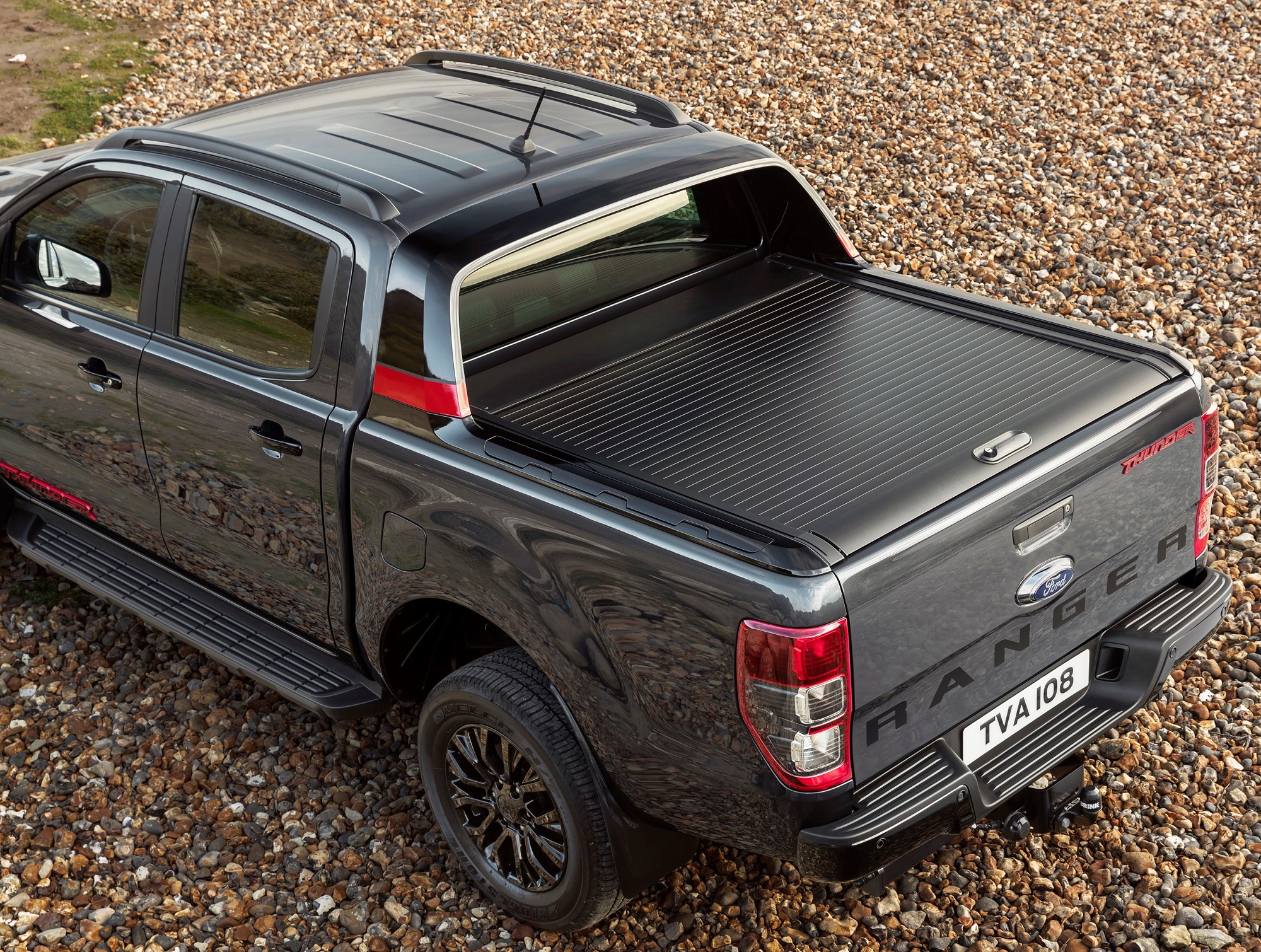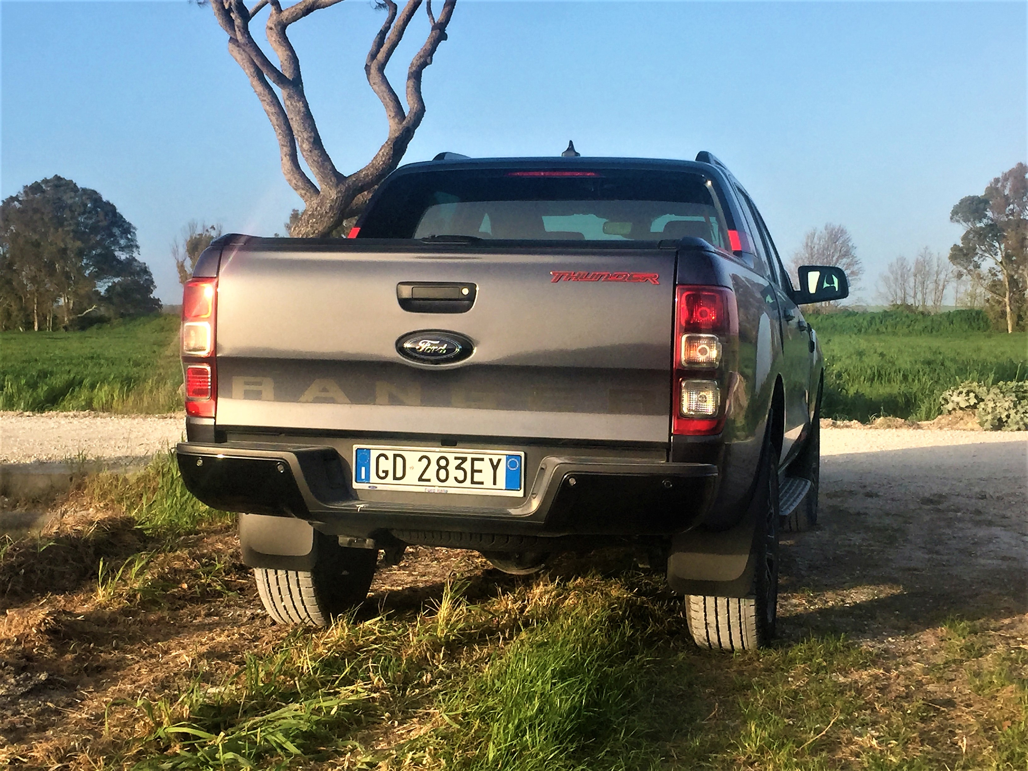 Bello è bello, non c’è che dire. Il Ford Ranger Thunder, serie limitata per l’Europa in soli 4.500 esemplari, si presenta nella sua livrea di lancio, Sea Gray, che richiama proprio il grigio di un mare in tempesta, l’analogia con il tuono (thunder) è evidente. Una serie di evidenze in Race Red (rosso corsa) posizionate nei punti chiave mette in risalto lo spirito sportivo e la grinta del veicolo. Il look da duro delle praterie è completato da cerchi in lega verniciati in nero lucido da 18”, finiture in nero ebano per la griglia anteriore, paraurti posteriore, predellini e maniglie delle porte.