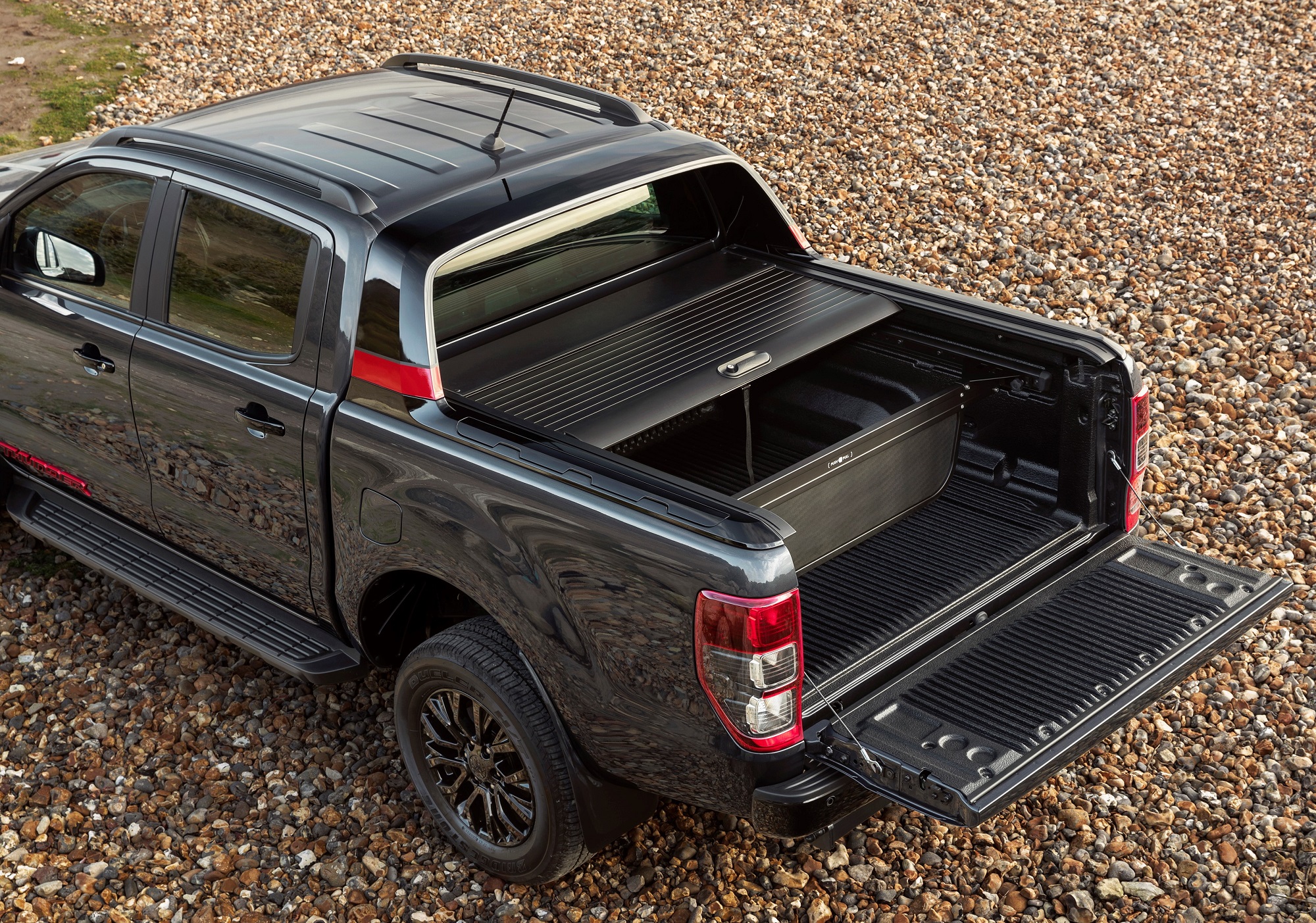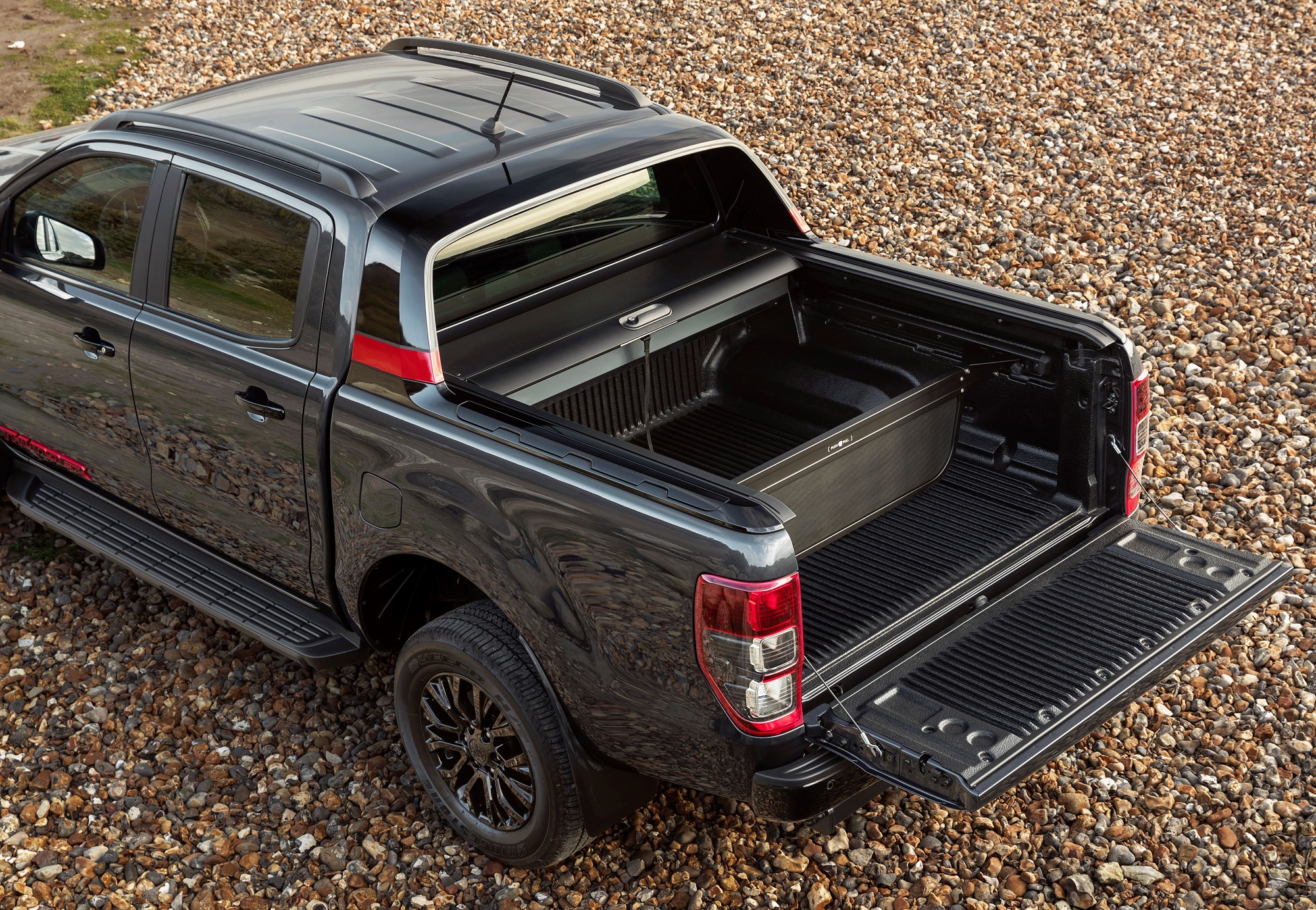 Il cassone del Thunder viene fornito di serie con copertura Roller. Un telo avvolgibile in materiale plastico molto comodo per tenere al riparo il carico dalle intemperie e da occhi indiscreti. Lungo 1.575 mm, largo 1.560, 1.139 fra passaruota, con sponde da 840 mm di altezza il vano di carico consente di trasportare un carico massimo di 1.024 kg. La sponda posteriore richiede poco sforzo per l’abbassamento grazie al sistema EasyLift. Quando aperta può sostenere un peso massimo di 75 kg. Un faretto inglobato nel rollbar aerodinamico, verniciato in Black Ebony e rifinito con strisce Race Red alla base, illumina il vano di carico. Quest’ultimo, rivestito in materiale plastico antisdrucciolo contiene una pratica scatola porta attrezzi rimovibile, dotata di un meccanismo di rotazione che consente di girarla, per facilitare il carico di strumenti e attrezzature varie.