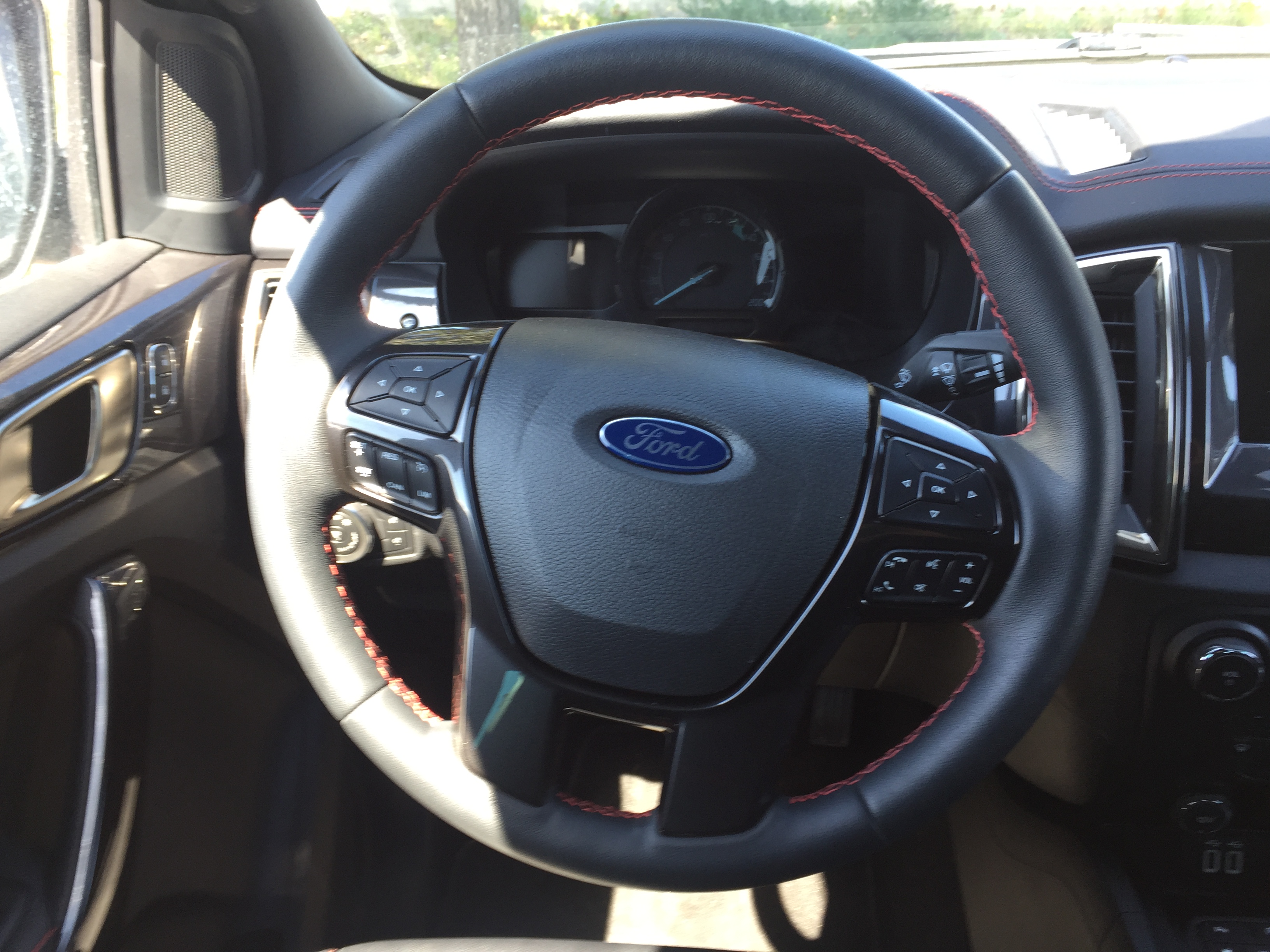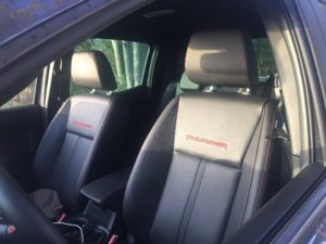 Il Thunder è un doppia cabina a cinque posti. All’interno domina la pelle nera con impunture rosse a contrasto che riveste i sedili, la corona del volante e la parte superiore della plancia. I battitacco interni sono in alluminio satinato con la scritta Ranger illuminata di rosso. La plancia è rifinita con inserti lucidi Ebony Black. Al centro spicca il touchscreen da 8” del sistema multimediale Ford SYNC 3 che comprende il navigatore e la funzione pinch&swipe (quella che serve ad allargare le immagini nello schermo con le dita come negli smartphone per intenderci), compatibile con Apple CarPlay e Android Auto.