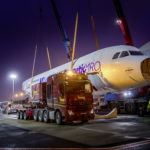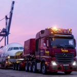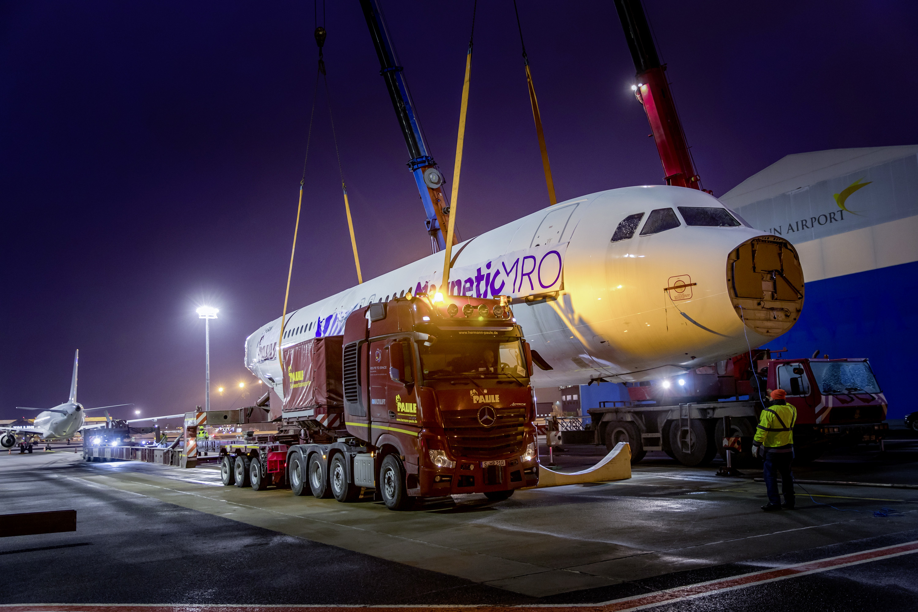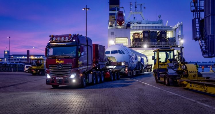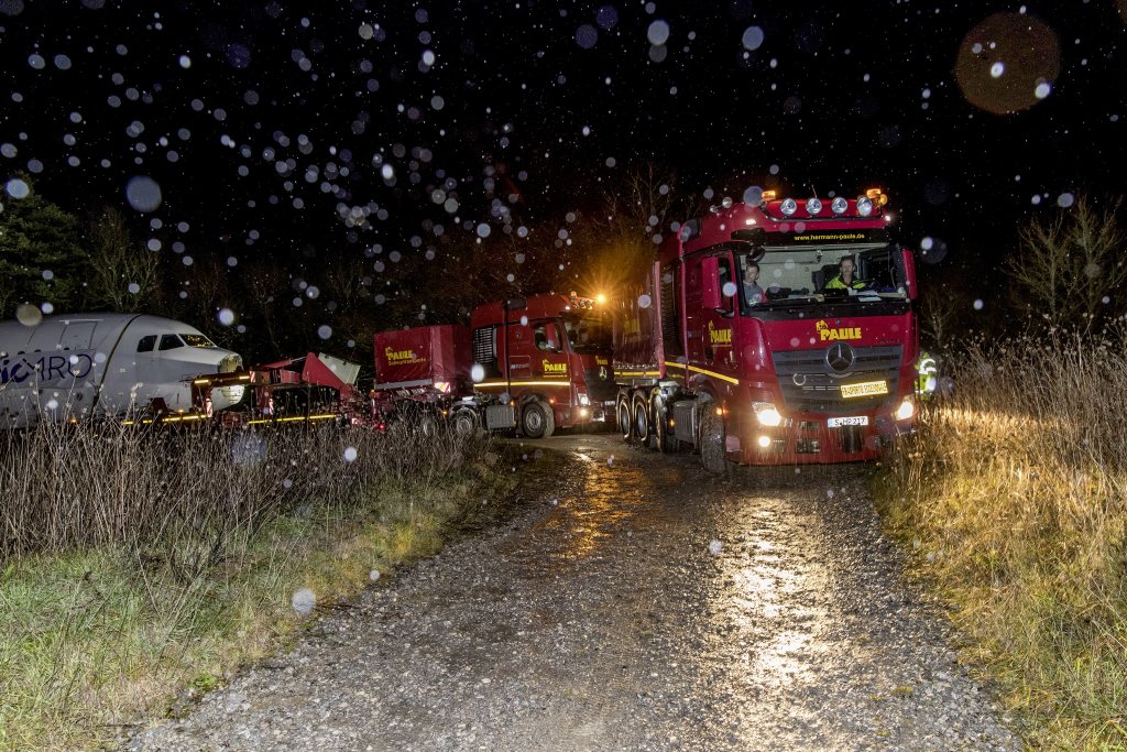 Dopo aver attraversato il Mar Baltico a bordo di un traghetto, l’Actros, con l’ingombrante carico, è sbarcato nel porto Seelandhafen di Lubecca. Da qui, il trasporto eccezionale ha raggiunto in tre notti la zona settentrionale della Foresta Nera, passando per Amburgo, Magdeburgo, Norimberga e Stoccarda. Il veicolo ha dovuto abbandonare due volte l’autostrada a causa di cavalcavia troppo bassi. Non solo: uscendo dall’autostrada, l’Actros SLT ha imboccato una strada secondaria, sulla quale il conducente ha dovuto percorrere un lungo tratto in retromarcia, prima di poter rientrare in autostrada lungo la direzione di marcia opposta. Per l’operazione di scarico è stata impiegata un secondo truck Actros SLT. Lungo una stretta e ripida strada forestale, il tandem composto dai due SLT ha infine condotto l’Airbus nella sua nuova destinazione, il campo di addestramento del Comando forze speciali KSK di Calw.