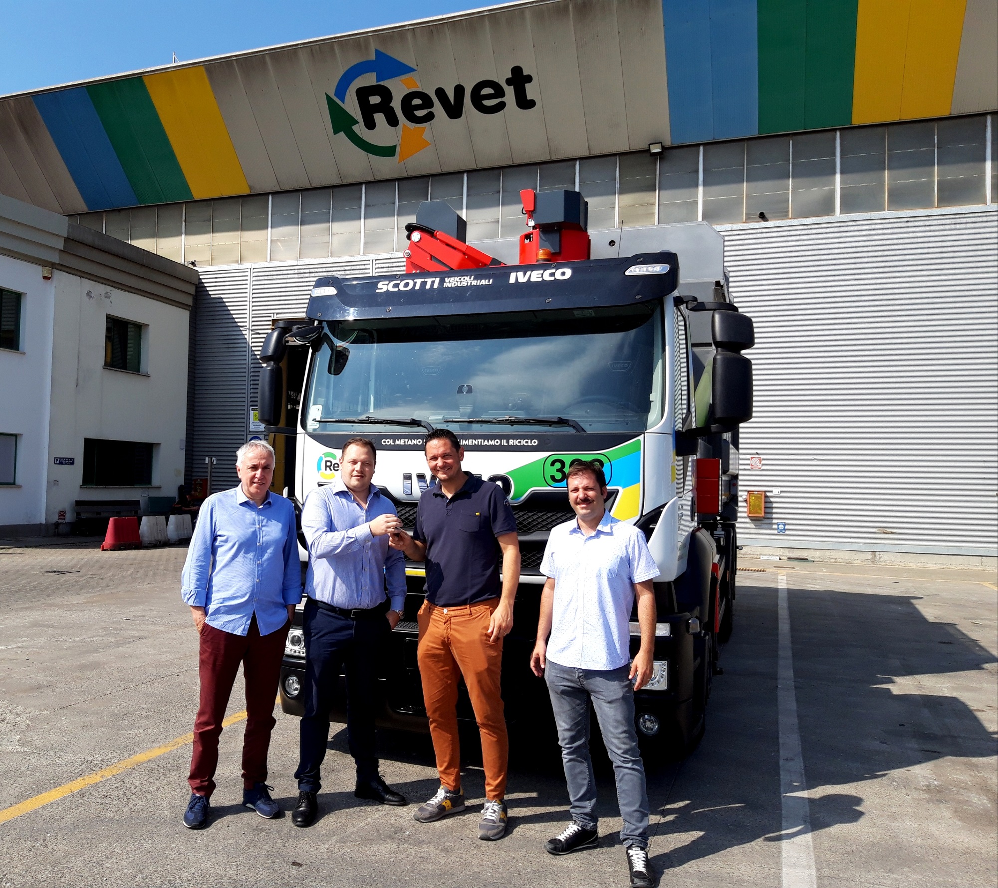 Alla cerimonia di consegna erano presenti il responsabile Progettazione Servizi, Raccolte e Manutenzione Mezzi della Revet SpA, Nicola Mattiazzo, Ubaldo Deodati, District and KA Manager IVECO e Claudio Bensi, responsabile commerciale della concessionaria Scotti Veicoli Industriali SpA che ha curato la trattativa.