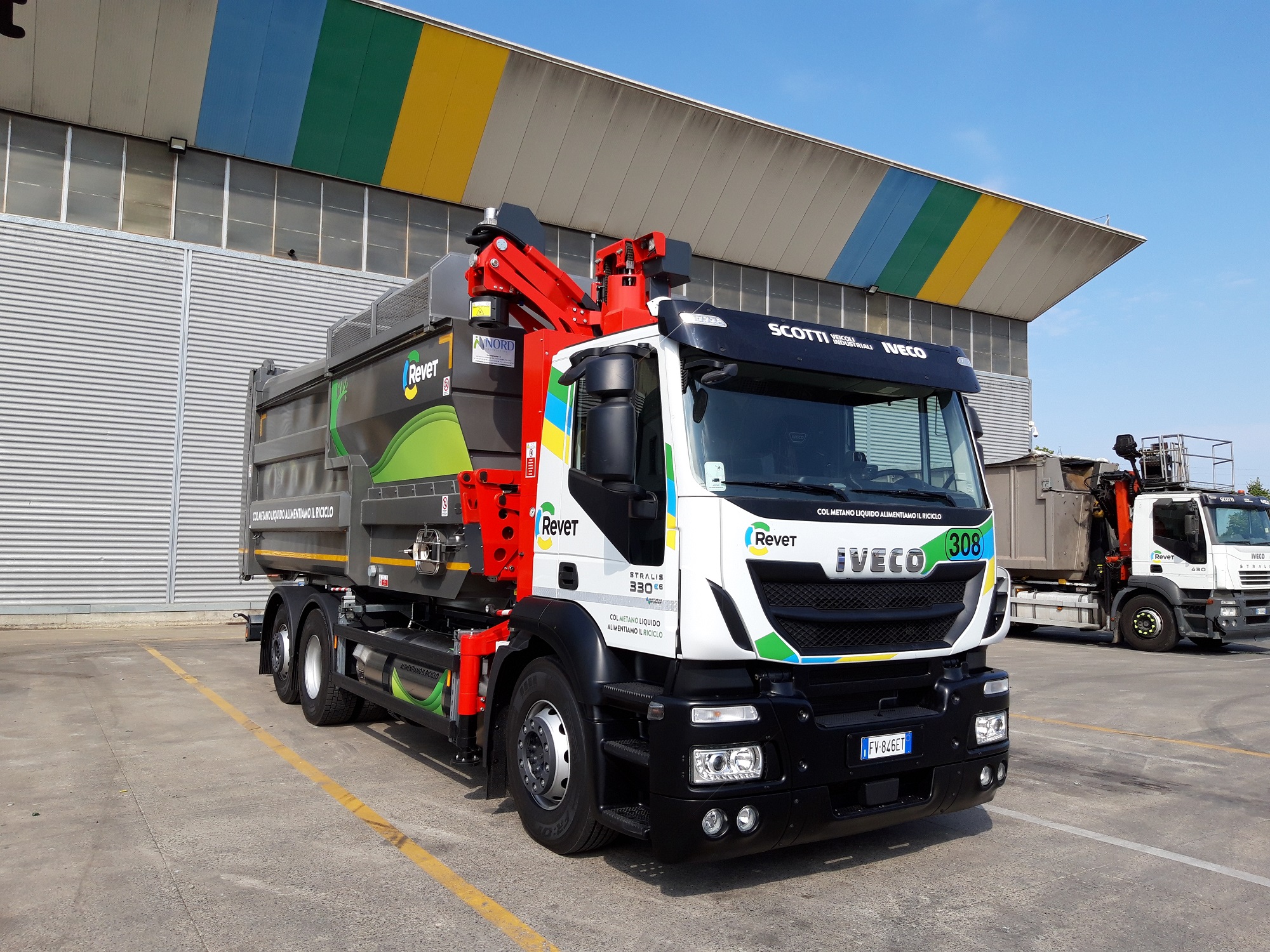 L’IVECO Stralis AD260S33YPS-C-LNG, è stato consegnato presso la sede di Pontedera (PI) della Revet SpA. Si tratta di un autocarro a tre assi, spinto da un motore Cursor 8 da 330 cv, abbinato a un cambio Allison, equipaggiato con uno speciale allestimento della Nord Engineering specifico per la raccolta del vetro.