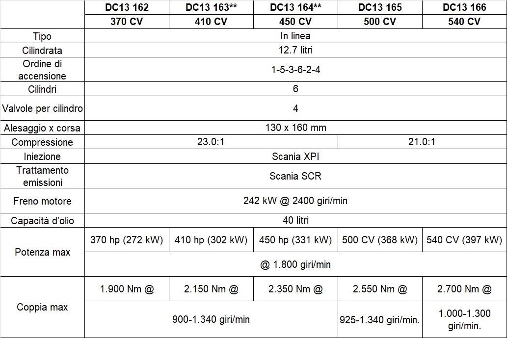 Dati tecnici gamma 6 clindri Euro 6 da 13 litri Scania