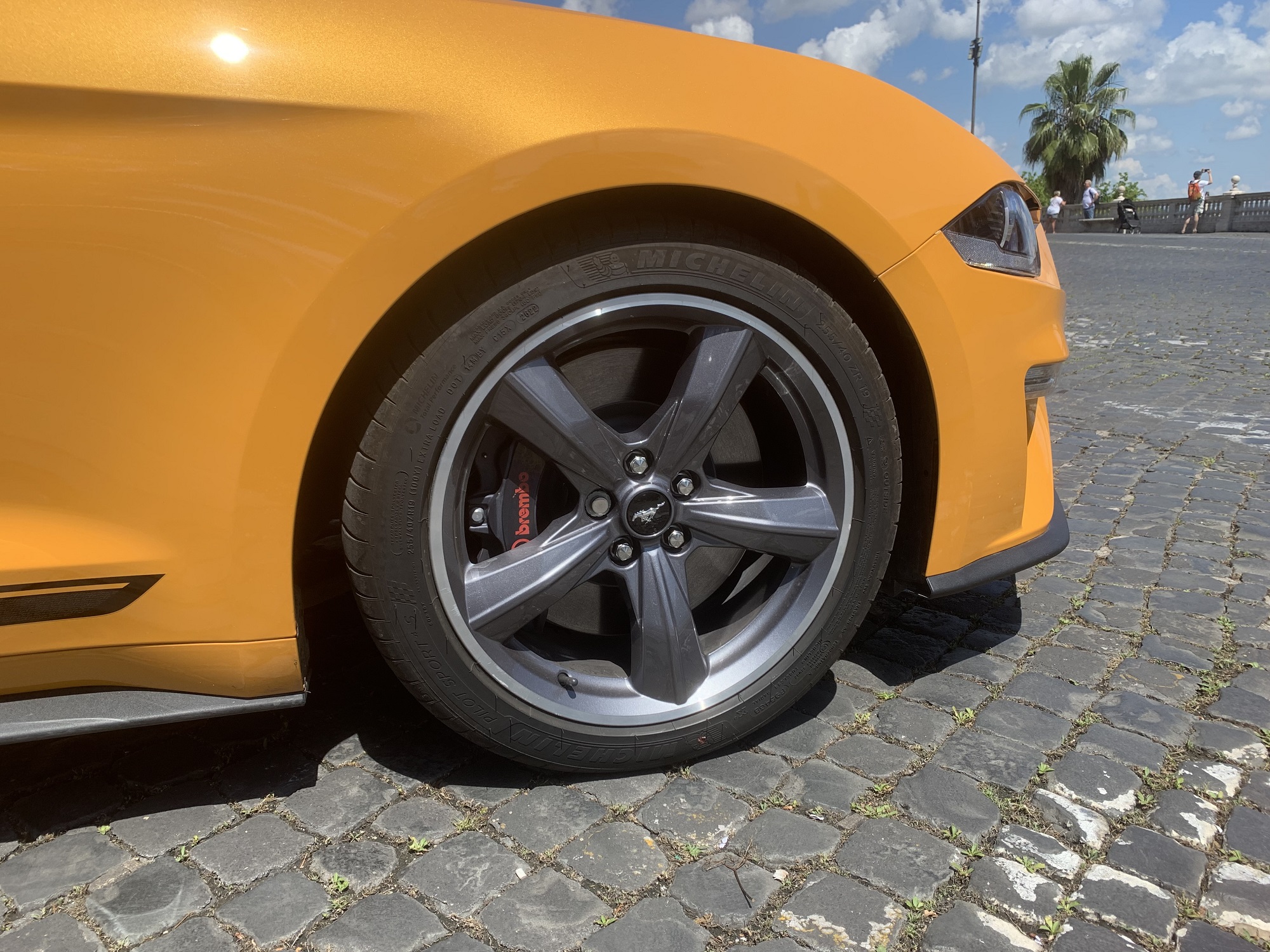 Emozionatissimi ci sediamo al posto guida. Immediatamente ci siamo fatti spiegare come abbassare la capote elettrica. Dopodiché con grande emozione siamo andati a pigiare il pulsante “Start” alla destra del piantone dello sterzo e il poderoso Ford Coyote V8 di ultima generazione ci accoglie così: “Bruaaabbbbttttt, vooom, vooom, vooom…” Il cuore pulsante della Mustang non fa nulla per nascondere la sua potenza. Le fasi di accensione 1-5-4-8-6-3-7-2 si alternano in armonia nel tipico minimo disassato dei V8, suscitandoci una tachicardia irrefrenabile.